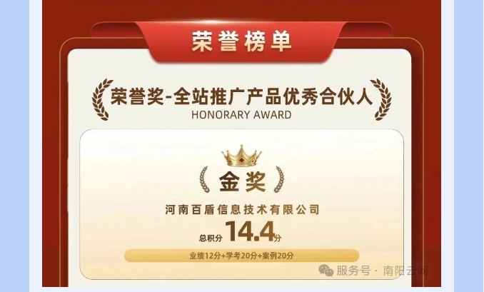 值得關(guān)注的是,河南百盾近期還斬獲了"全站推廣產(chǎn)品優(yōu)秀合伙人金獎(jiǎng)"。